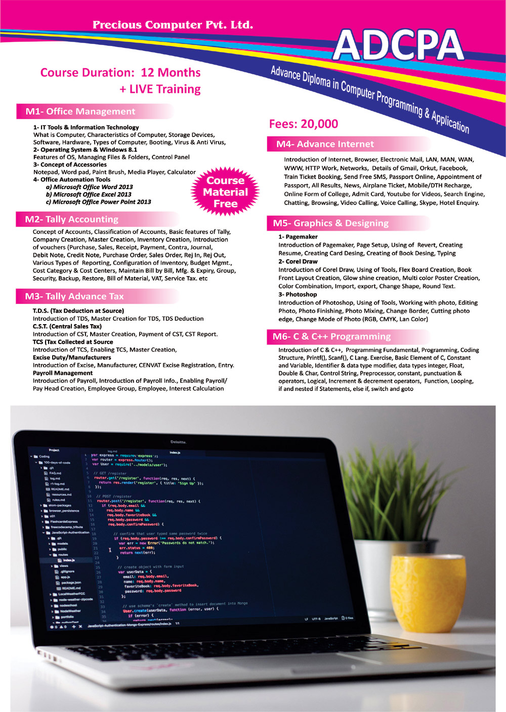 Precious Computer Provides 100% Genuine Certificate to Students and Provides World Class High Quality Course Material for the Future of Students. Precious Computer Provides Class 1 Hours and Labs 1 Hours per Day to Students and Immediate in providing employment to students Keeps Precious Computer Full Time Teacher, so that students have knowledge of entire computer